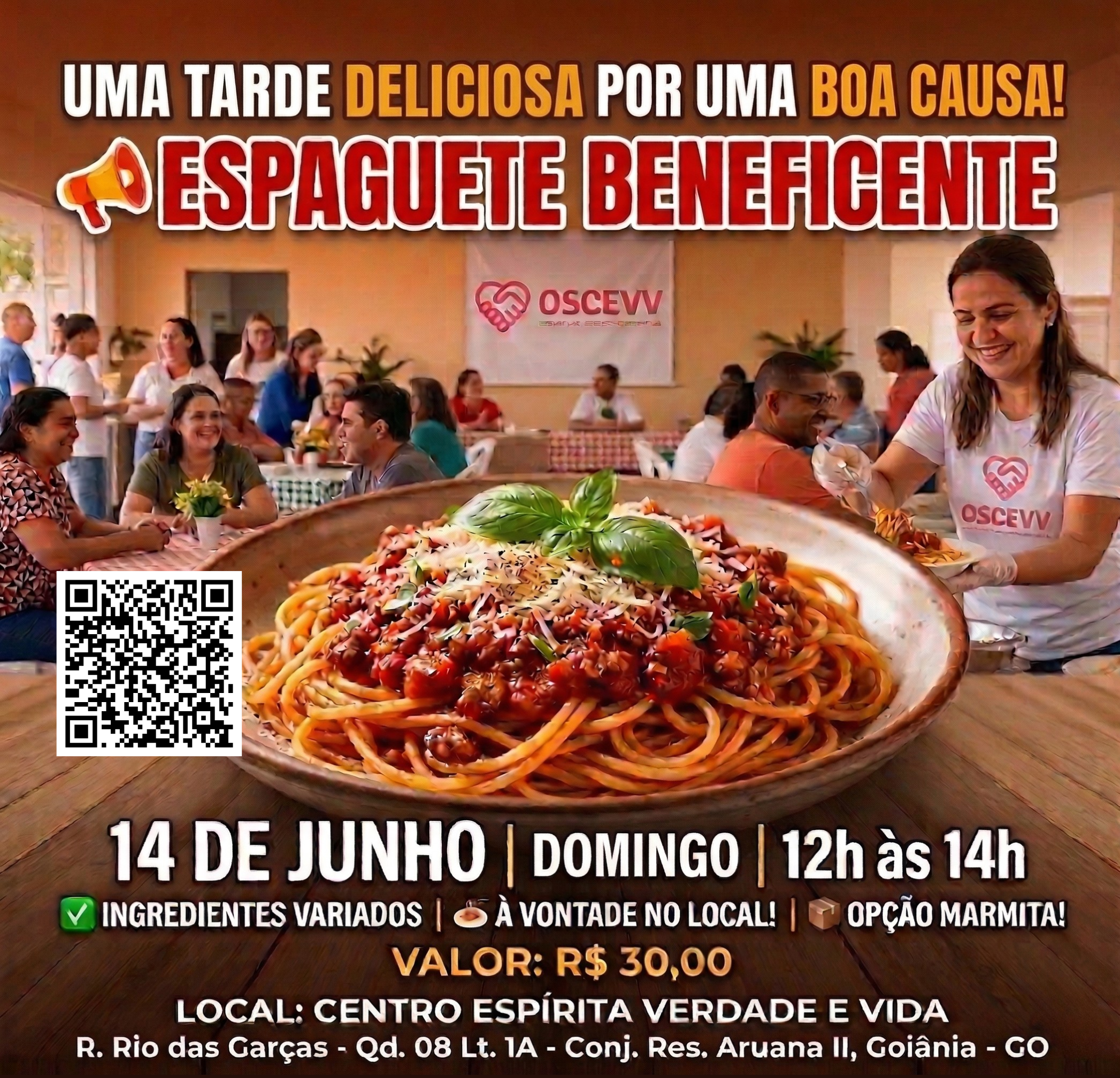 No dia 14 de junho de 2026, o Centro Espírita OSCEVV terá o prazer de realizar um Espaguete Beneficente em prol de suas atividades assistenciais. Venha participar desse evento especial e contribuir para ações que promovem o bem-estar e a solidariedade.